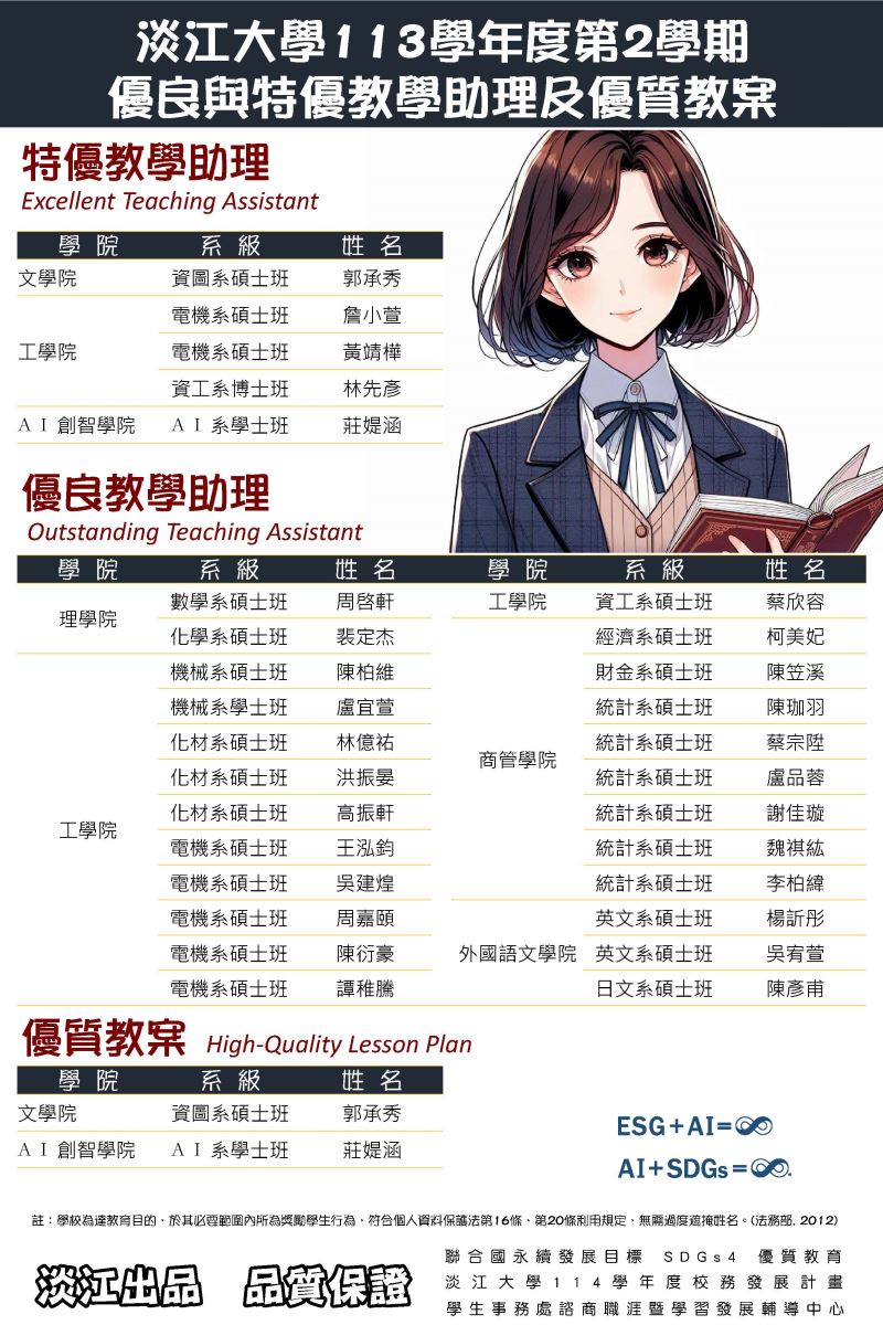 恭喜碩士班郭承秀同學 榮獲113學年度第2學期 特優教學助理 及 優質教案 二項殊榮